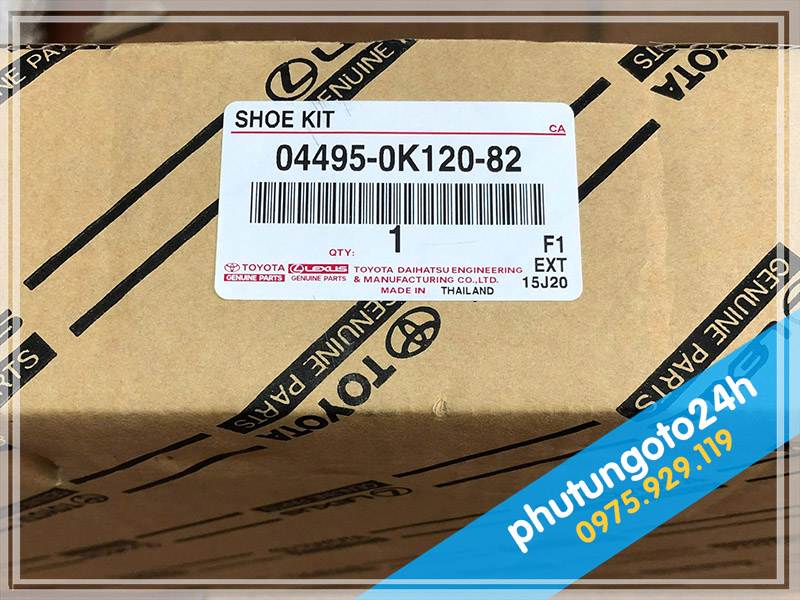 Bố thắng sau xe Hilux chính hãng có tên phụ tùng là Shoe Kit - mã 04495-0K120-82, chữ Thailand đen đậm, có 3 hàng chữ đen đậm góc dưới phải, nền trắng có in nghiêng chìm dòng chữ Genuine Parts chống làm giả
