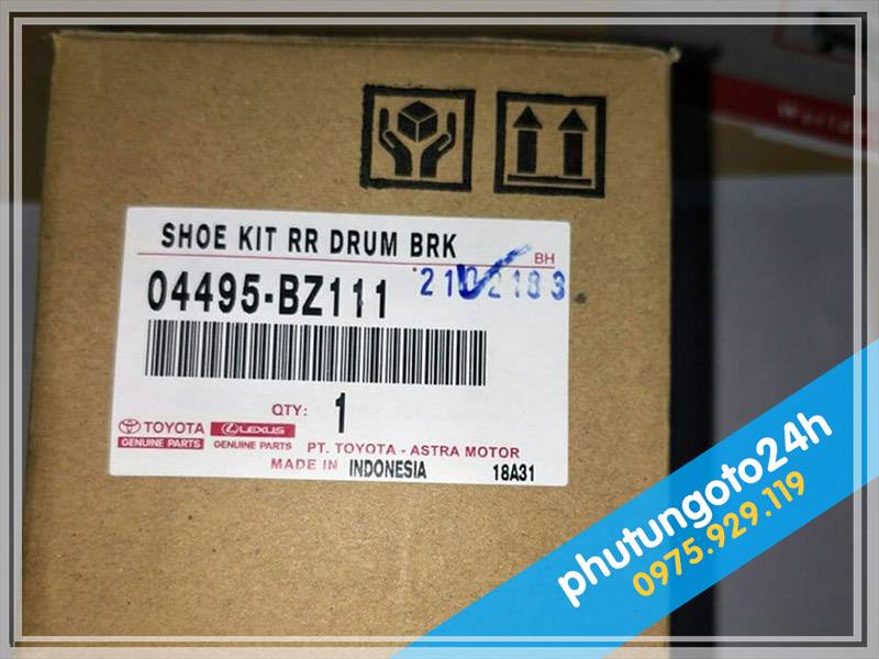 Bố thắng sau xe Wigo 1.2 chính hãng được đựng trong hộp các tông màu nâu, có nhãn phụ tùng chuẩn nhà máy Toyota Indonesia phát hành