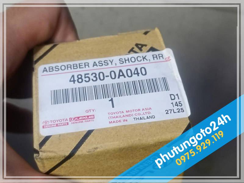 Giảm xóc sau xe Corolla Cross 1.8 chuẩn chính hãng được đựng trong thùng các tông, có nhãn phụ tùng chuẩn nhà máy Toyota Thailand phát hành. Công nghệ chống giả mới nhất, nền trắng có in chìm dòng chữ Genuine Part chỉ nhìn thấy khi để nghiêng